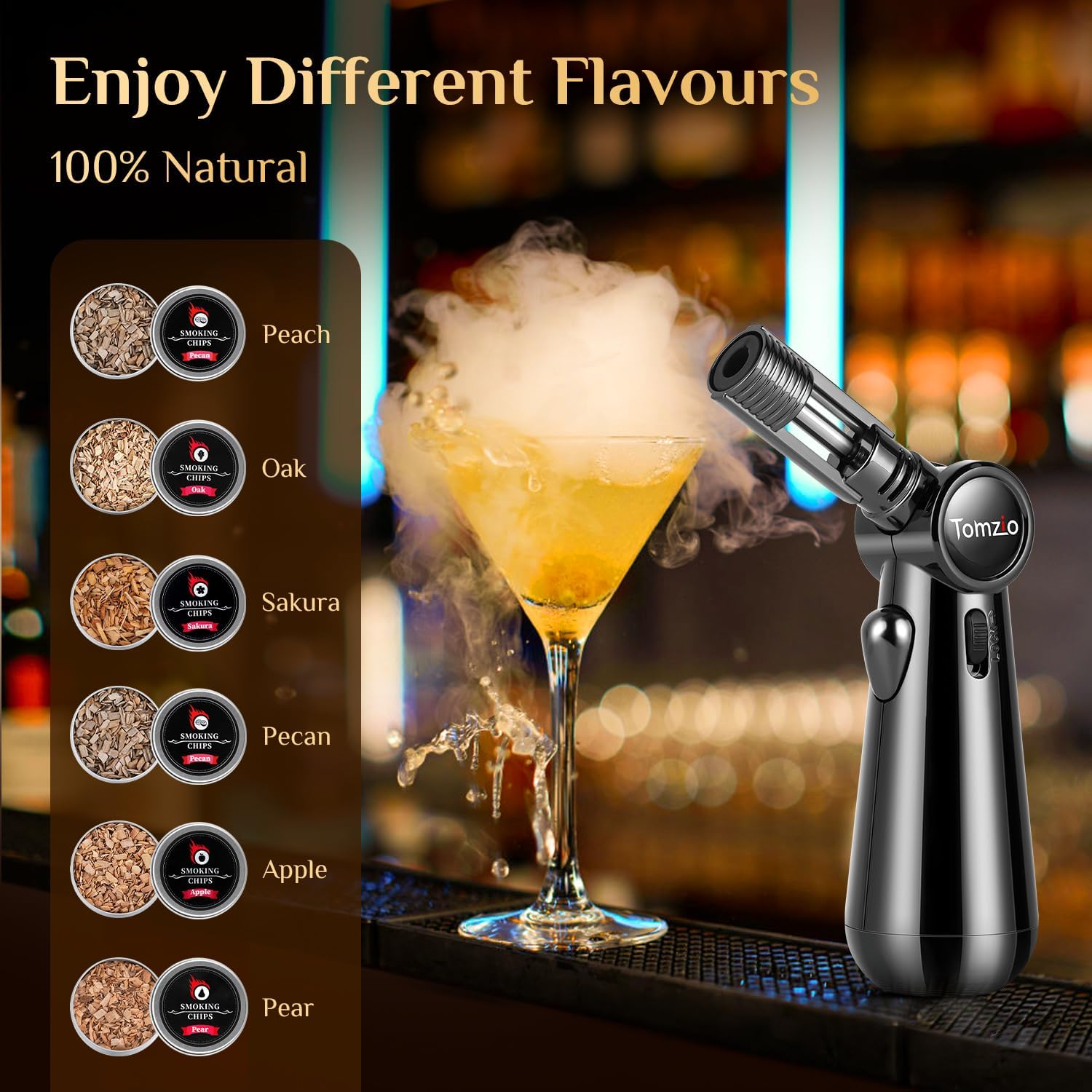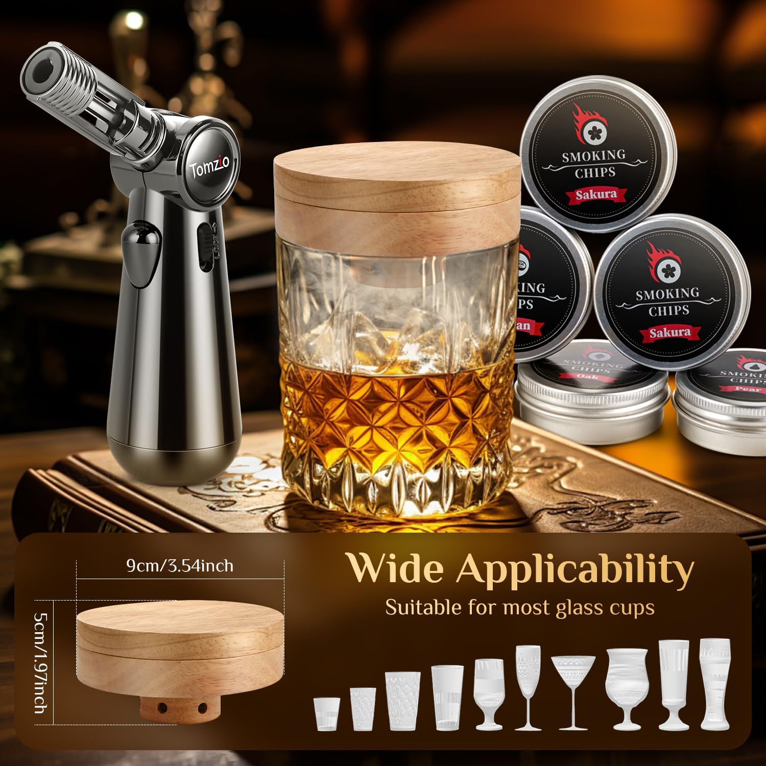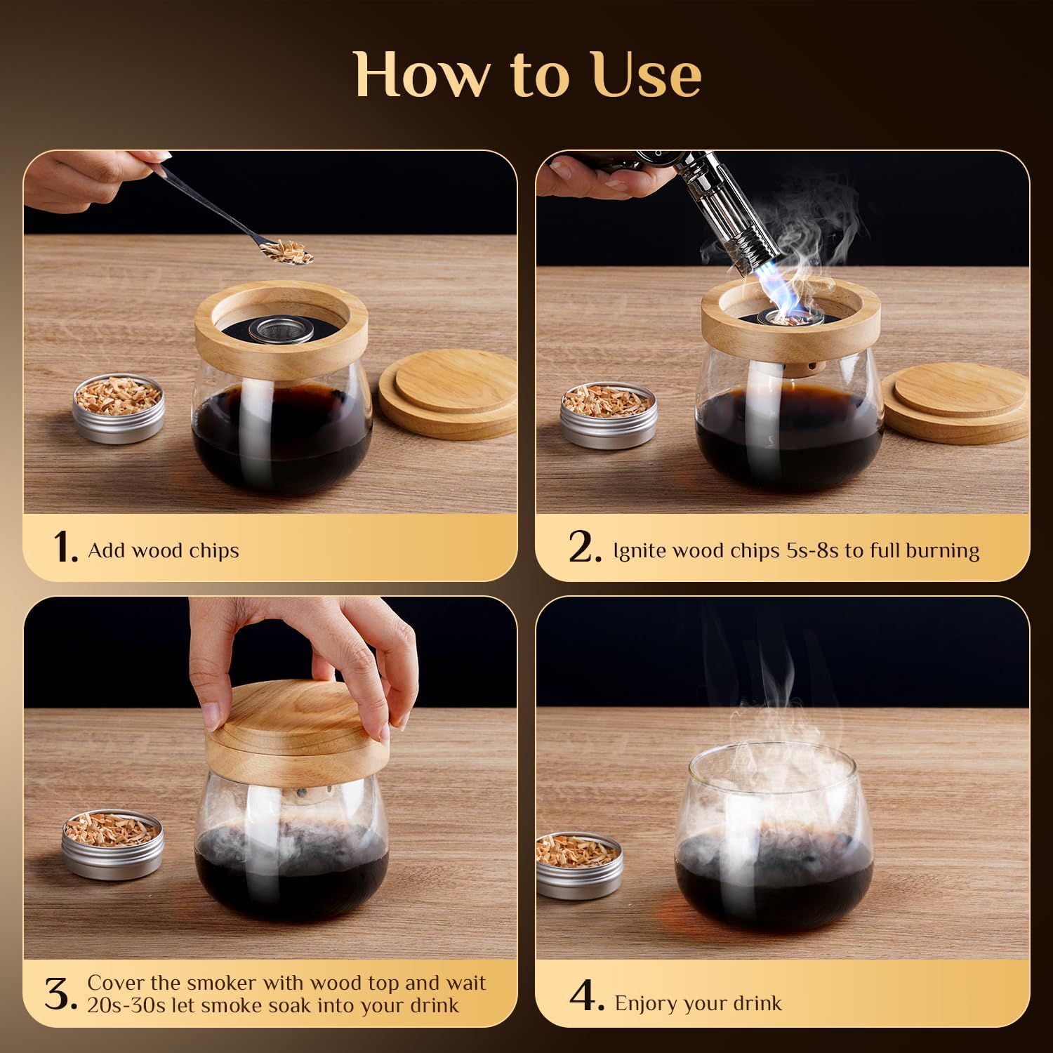 - 【100% Natural 6 Flavors Wood Chips】After extensive screening and testing, we've chosen wood chips witch specifically tailored to suit American tastes.Our selection features 6 delicious flavors: peach, oak, sakura, pecan, apple, and pear. Our whiskey smoker kit's wood chips are 100% natural with no additives, ensuring that only the sweet, fruity aroma of the wood is released when burned, without any harsh odors. Perfect for enhancing your drink experience!