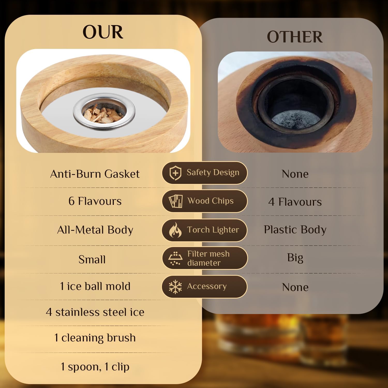 - 【Extensive Cocktail Smoker Kit】20-piece accessories PREMIUM cocktail smoker kit! It comes with everything you need for the tasting drink process, so you won’t have to buy any extra products. Save time and money with this all-in-one cocktail smoker kit!Our old fashioned drink smoker kit Included 1 Torch,1 Smoker,6 flavours wood chips,2 filter, 1 Anti-Burn Gasket, 4 stainless steel ice, 1 ice ball mold, 1 cleaning brush, 1 spoon, 1 clip.